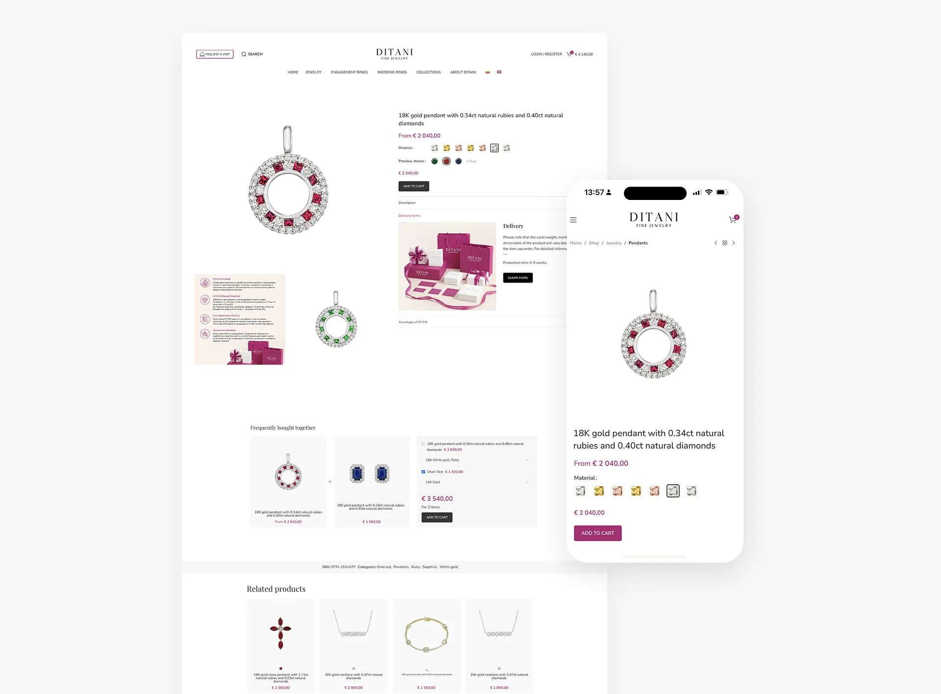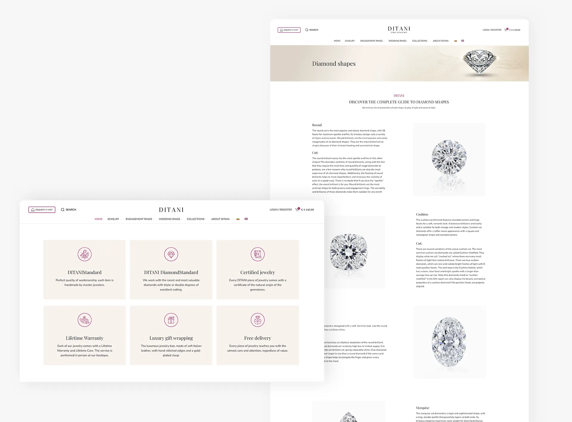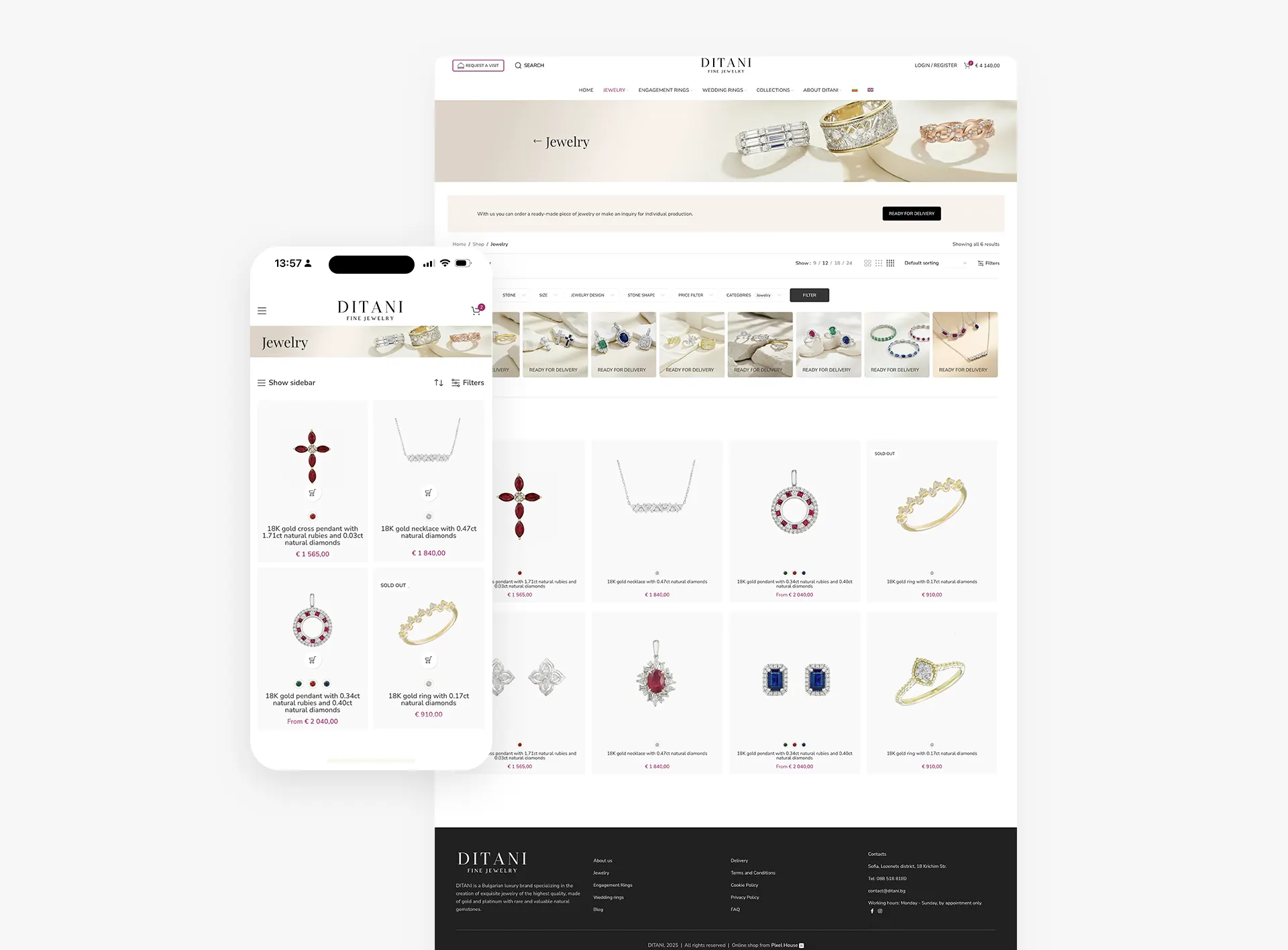 За Ditani разработихме уеб дизайн и изработка на онлайн магазин за бранд, специализиран в създаването на висококачествени бижута с изискан и елегантен стил. Платформата предлага добре структурирани продуктови категории, разширени филтри и интуитивна навигация, които улесняват избора и разглеждането на колекциите.
